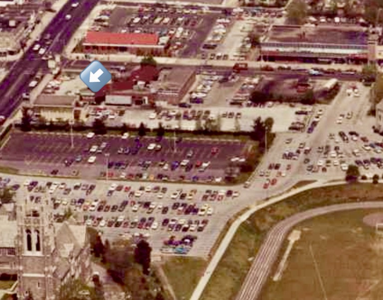 God works in mysterious ways as they say and over the past several months I felt that the time had finally come for me to confront my fear and see that sacred ground where Dennis had passed. So I began to plan for my trip to Saint Joseph’s University campus a few weeks ago but quickly realized that the actual building where Dennis had collapsed and died that day — the First Pennsylvania Bank and Trust on the corner of City Avenue and N54th Street — had been replaced back in 1998 with the unveiling of Mandeville Hall and the all new Erivan Haub School of Business, one of the most beautiful buildings that adorn the campus. And with the help of Lesley Carey, the Archivist at Saint Joseph’s Library, we were able to confirm the exact location of the bank back in April 1972 which is where the photo was taken of me holding flowers and a picture of Dennis that graces the cover of this blogpost . Although we could not find any clear photos of the bank building by itself, we did find an aerial shot that was taken in 1972 of the corner of City Ave and N54th Street with the bank building located in the upper left hand corner of the photo as indicated by the blue arrow.